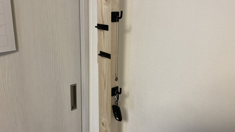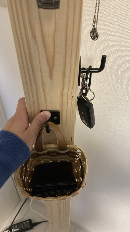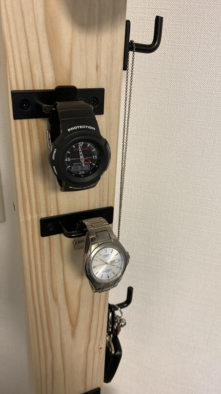 上にネックレス、下に鍵を吊るしておけます。別にこれはどっちでもいいとは思いますが鍵は使用頻度が高いので、1番手に取りやすいと思った高さに付けました。