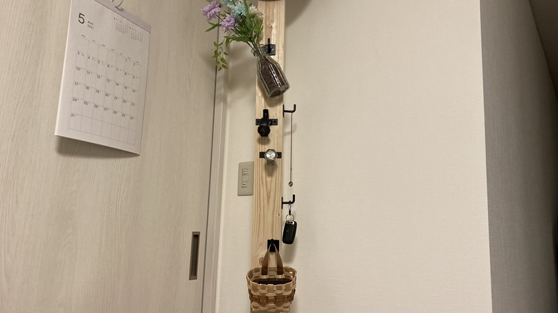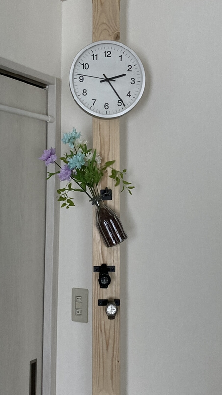 掛け時計の下に造花、その下の腕時計、サイドに鍵、下の取り出しやすい位置にカゴと決めました。