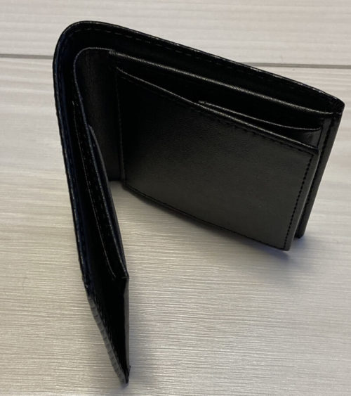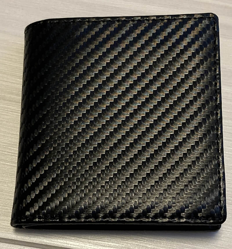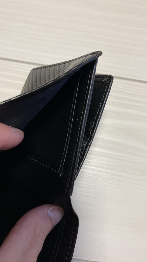 見た目は小さめの二つ折り財布。カーボンレザーはちょっと微妙かな……と購入前は思っていましたが、実際に見ると安っぽさはなくカッコよかったです。ずっとこれでもいいくらい。