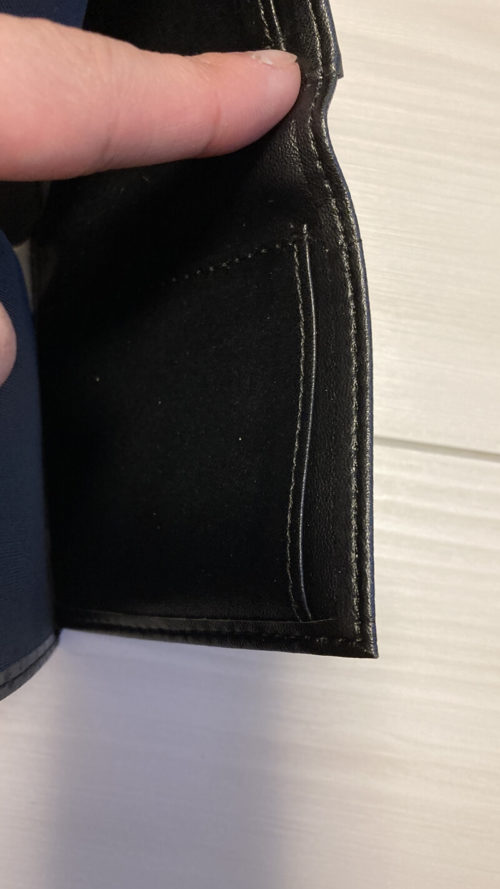 手前のポケットは若干緩いので、財布が勢いよく飛んでいった場合カードが飛び出るかもしれません(そんなシチュエーション、そうそうないとは思いますが……)