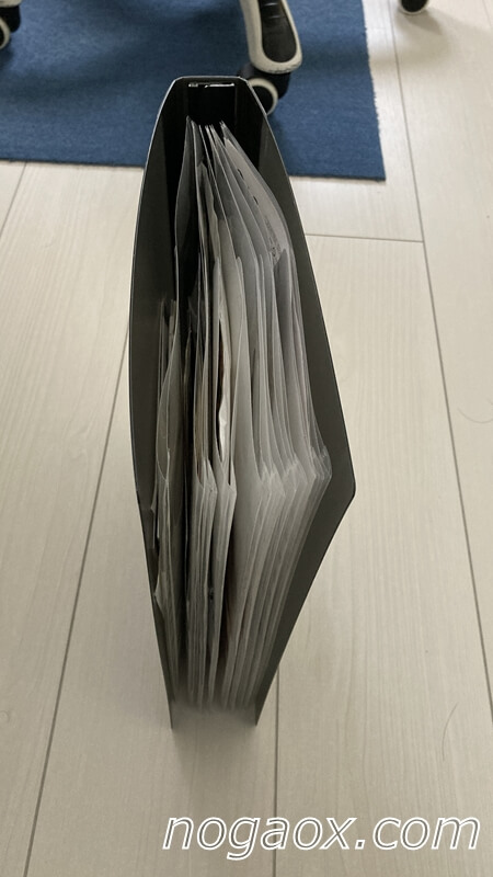 10枚入れるとこのようにパンパンになるので、説明書類の量によりますがリフィルは10枚が限界だと思います。8枚くらいで抑えたほうがいいかもしれません。