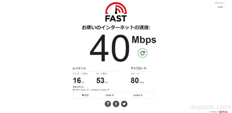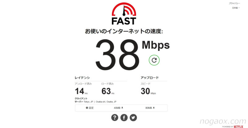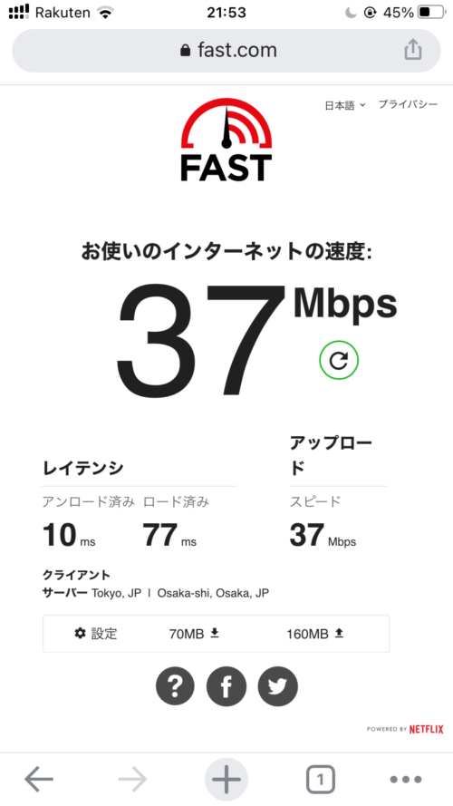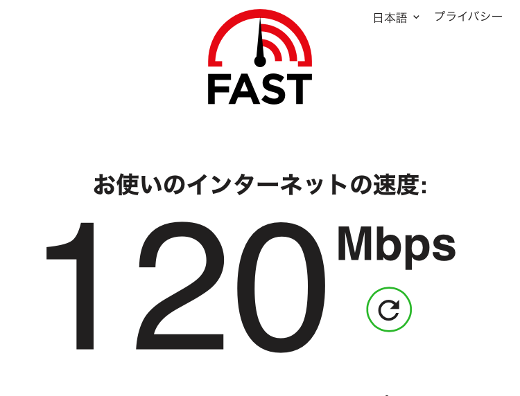 素晴らしい速度。何をするにも一切困らない上に、毎日測ってみても常にこのくらいの速度を出してくれます。アップロードはなぜか遅め。