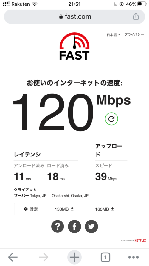 PCでの測定と大差なし。実は今日始めて計測したので、後日他の時間帯でも何度か測定してみようと思っています。安定してこのくらい出せるのか、時間によっては10も出ないのか、それでもある程度ノンストレスなのか、くらいは興味あります。